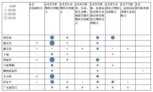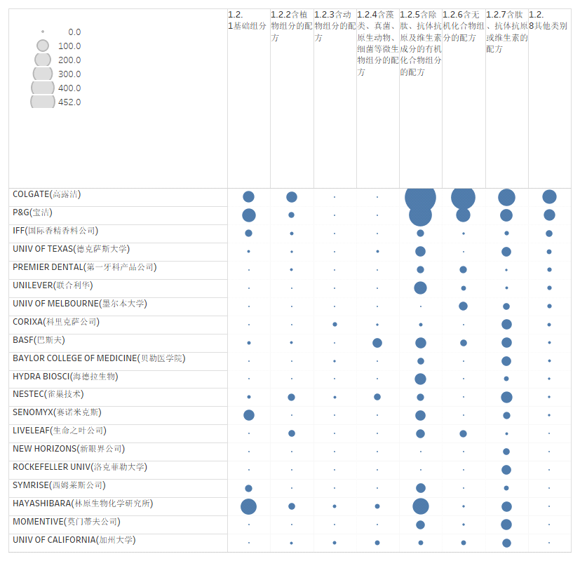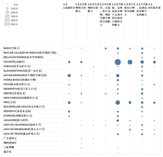 从横向分布来看,高露洁和宝洁的专利分布最为广泛,除1.2.3(含动物组分的配方)和1.2.4(含藻类、真菌、原生动物、细菌等微生物组分的配方)两个技术分支外,其他六个技术分支均有一定量专利分布;林原生物化学研究所、巴斯夫、国际香精香料公司、德克萨斯大学、雀巢技术和加州大学专利分布也较为广泛,专利分布的特点是专利申请重点分布在个别技术分支,其他技术分支虽有涉及,但绝对数量较少。