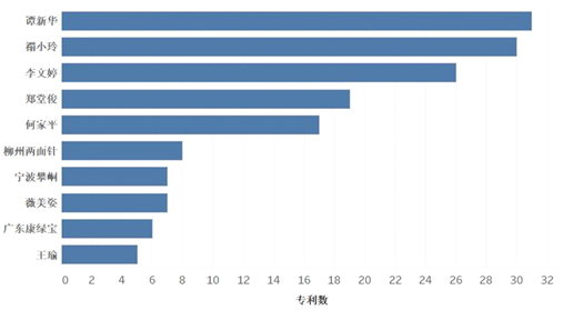 牙膏中国国内申请量排名Top10中,如图1.3.3所示,前五名均为自然人申请人,其中禤小玲和谭新华的申请人地址为同一住址;后五位有四个公司申请人和一个自然人申请人。前五名申请人的专利申请时间均从2017年开始,目前所有的六名自然人申请人均没有专利获得授权。