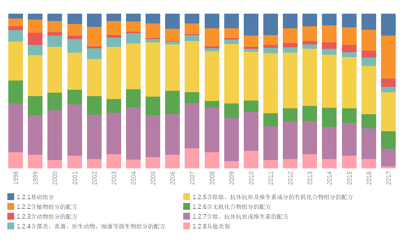 牙膏的八个技术分解随时间的申请量占比如图2.1.1所示。其中,1.2.5(含除肽、抗体抗原及维生素成分的有机化合物组分的配方)和1.2.7(含肽、抗体抗原或维生素的配方)两个技术分支申请量历年占比最多,但近五年占比呈现减少趋势,1.2.2(含植物组分的配方)技术分支的占比逐年增加。。