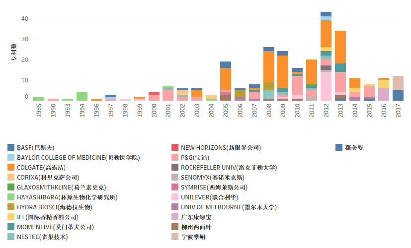 如图2.4.1所示,针对国内外市场主体在中国的布局趋势进行分析,从申请总量来看,2012年达到了申请最高点。从1985年开始,林原生物化学就有相关的专利申请;宝洁、高露洁、巴斯夫、联合利华、新眼界公司和雀巢技术分别从1990、1996、1997、1998、2000和2002年开始在中国申请相关专利。从2008-2013年国外主要市场主体特别是高露洁、宝洁、联合利华和巴斯夫在中国的专利申请量处于高位,从2014开始,国外主要市场主体在中国的专利申请量显著滑落。