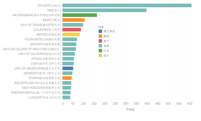 在牙膏的全球主要申请人排名中,如图2.3.1所示,美国、日本、德国、荷兰、瑞士和澳大利亚均有申请人进入Top20排名,未有中国国内申请人进入全球Top20排名。申请量前五名依次是美国高露洁、美国宝洁、日本林原生物化学研究所、德国巴斯夫和美国德克萨斯大学。值得注意的是,在全球Top20的申请人中有5所大学申请人,其中有4所为美国大学。